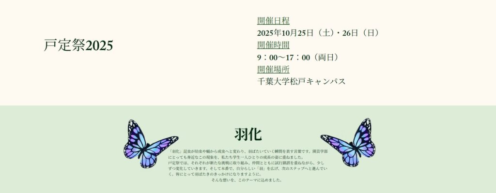 松戸キャンパスの「戸定祭」は、千葉大学園芸学部の学園祭です。地域の来場者も楽しめる学園祭として位置づけられており、学生主体の実行委員会を中心に運営されています。